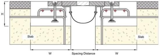 The shape memory alloy used in this study was assumed to be a nitinol-based shape memory alloy comprising 50.7% Ni and 49.3% Ti. To simulate the hyperelastic behavior of the shape memory alloy, the properties were generated using the UMAT function within the Abaqus program [11]. Figure 5 shows the representative parameters required for modeling the properties of the superelastic shape memory alloy with UMAT. The critical material parameters include the initial elastic modulus (EA), tangential elastic modulus (ET), forward and reverse phase transition stresses (σFs, σFf, σRs, σRf), and maximum strain (εT) [12]. The austenitic Poisson’s ratio and martensitic Poisson’s ratio were fixed at 0.33. For the finite element analysis of the expansion joint devices, the specifications of the devices currently in use on public bridges were examined. Figure 6 demonstrates the determination of the gap distance between girders based on the amount of expansion and the selection process for the height and length of the block out, which ultimately influences the size of the expansion joint device. The representative specifications for these devices are summarized in Table 7. It should be noted that these standards are adaptable to specific on-site conditions. In this study, the design concept for the rubber expansion joints in the expansion joint devices was developed based on the standard specifications provided in Table 7. A detailed concept of this design is presented in Figure 7.