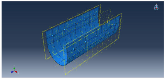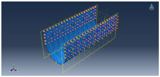 Based on the established design concept, modeling was performed using the finite element analysis software Abaqus [13,14,15,16,17]. The expansion joint modeled through Abaqus is shown in Figure 8. During the meshing stage, all water-stop material parts were meshed in a hexagonal form based on the “structured technique”. The hexagonal mesh enhances the speed and stability of the finite element analysis in this study, owing to its stable rectangular parallelepiped shape. The modeled expansion joints were designed to maintain the specified gap distance and to accommodate movements both along and perpendicular to the bridge axis. Expansion joint devices are typically fabricated and installed either as complete units or in segments of 1 m, depending on specific requirements. Consequently, the models employed in this analysis represent expansion joint devices with a length of 1 m. The displacement control in the models was executed based on the aforementioned minimum and maximum gap distances, with each expansion joint device model undergoing displacements of ±60 mm for Case-1, ±100 mm for Case-2, ±150 mm for Case-3, and ±200 mm for Case-4. In case of economic conditions, as shown in Figure 9, bolts were used to restrain it. Moreover, as damage from bolts may occur during actual water-stop material installation, general steel plates were reinforced on both sides of the contact area. At this time, because the water-stop material does not directly, but rather indirectly, affect the deformation of the expansion joint, the general steel plate part on one side was restrained in the y and z directions, and a load was applied in the x direction. Additionally, the general steel plate section to which no load was applied was restrained in all x, y, and z directions.