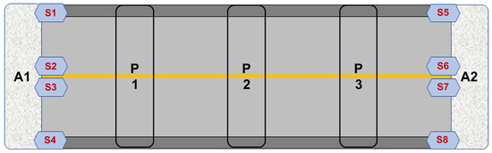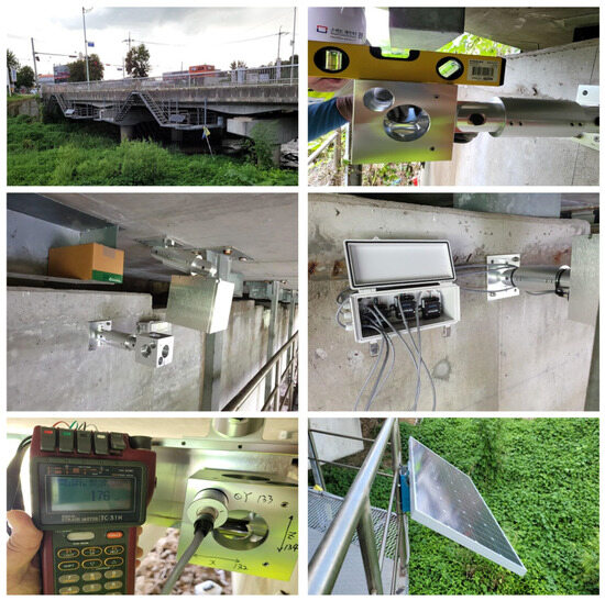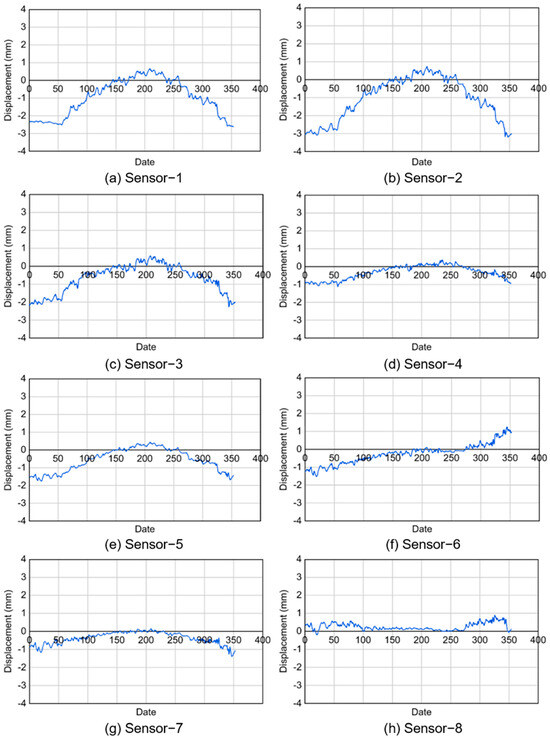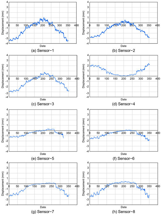 In this study, IoT sensors were installed at the abutment sections of the bridge, as direct attachment to the expansion joint devices was not feasible. Figure 11 illustrates the detailed placement of the lateral displacement IoT sensors, with four sensors installed on each side of the bridge abutments. To capture comprehensive displacement data, including the effect of seasonal temperature variations, lateral displacement data were collected over the course of a year. This dataset comprised the average daily displacement values spanning from January to December 2022.