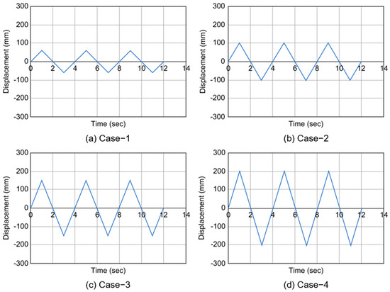Consequently, the displacement history curves employed in each finite element analysis model were idealized, as depicted in Figure 14. Recognizing that actual bridge axial displacements occur over an extended duration, the displacement history curve for short-term repeated load behavior verification was designed with a maximum displacement duration of 1 s, within a total cycle of 4 s.
