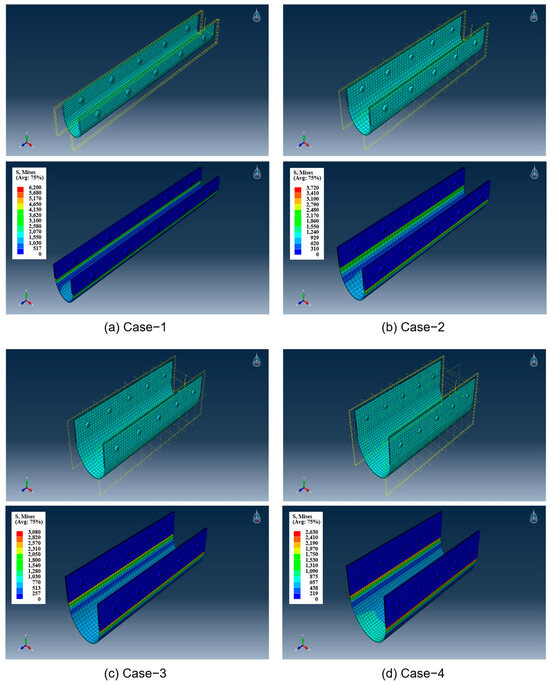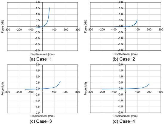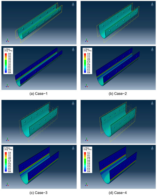 The analysis of the rubber expansion joints shows that the maximum load borne by the joints decreased as the displacement load increased. Specifically, the maximum loads were approximately 1.57 kN for Case-1, 0.6 kN for Case-2 and Case-3, and 0.44 kN for Case-4, as shown in Table 9. These results indicate the joints’ increasing maximum displacement in each case, demonstrating similar load-bearing capabilities regardless of the rubber expansion joint’s tolerance at specific displacement levels. Notably, all models of the rubber expansion joints remained within their elastic range, showcasing their ability to return to their original shape after deformation.