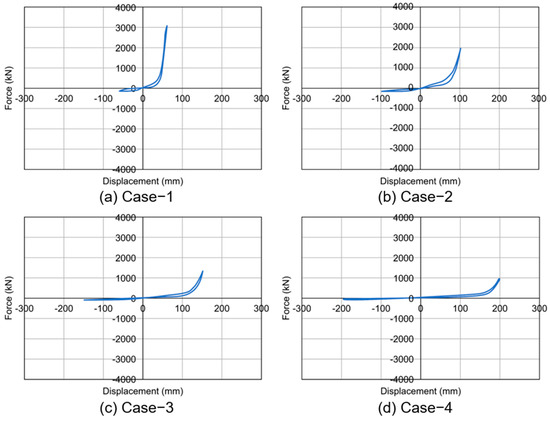 The axial direction analysis of the superelastic shape memory alloy expansion joints, as depicted in Figure 17 and Figure 18, exhibited a pattern akin to that of the rubber expansion joints, with a gradual reduction in maximum load corresponding to increased displacement load. The observed maximum loads were approximately 3052.62 kN for Case-1, 1999.60 kN for Case-2, 1348.90 kN for Case-3, and 967.36 kN for Case-4, as shown in Table 10. This behavior is attributed to the superior tolerance of superelastic shape memory alloy expansion joints to increased gap distances, despite the increase in the maximum displacement for each case. Moreover, when subjected to minimal displacement, the load values were smaller, as the joints did not bear direct loads. All of the models equipped with superelastic shape memory alloys experienced plastic displacement but demonstrated a flag-shaped recovery to their original form upon load removal. Significantly, none of the four models exhibited residual displacement, returning to their original shape post displacement-load removal. This characteristic highlights the potential effectiveness of superelastic shape memory alloys in bridge expansion joint applications, offering resilience and durability under varying load conditions.