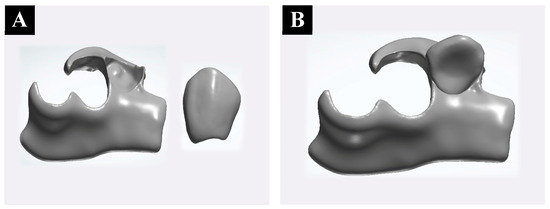 Computer-aided design of the flipper. (A) Individual design of the base and tooth parts. (B) Combination of the design parts.
