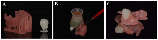 The digital impression of the maxillary and mandibular dental arches was made with an intraoral scanner (i700, Medit, Seoul, Republic of Korea) and saved in the polygon (PLY) format (Figure 2). After importing the scans to CAD software (DentalCAD 3.0 Galway, EXO-CAD GmbH, Darmstadt, Germany), the flipper was designed, and the software generated the designed flipper in separate parts for the tooth and base, but they can be merged also (Figure 3). Data generated were exported to a slicing software (ASIGA Composer 2.0, ASIGA, Sydney, Australia) to segment the 3D model to two-dimensional cross-sectional images for printing, and then three flippers were fabricated using a 3D printer (ASIGA UV Max, ASIGA, Sydney, Australia) in three ways. First, an artificial tooth and denture base were printed separately using tooth-colored photopolymerizing resin (Tera Harz TC-80DP A2, Graphy, Seoul, Republic of Korea) and pink-colored UV light-polymerizing resin (Tera Harz Flexible Denture—TFDH, Graphy, Seoul, Republic of Korea) for the tooth and base parts (Figure 4A). Afterward, to eliminate the residual photopolymer, the printed parts were cleaned with 99.5% isopropyl alcohol in an ultrasonic cleaner. The base part was first polymerized in an ultraviolet curing chamber (Tera Harz Cure, Graphy, Seoul, Republic of Korea) for 5 min and then additionally polymerized for 2 min with the tooth part that was seated in the socket. In this procedure, the liquid photopolymerizing resin (Tera Harz TFD-26, Seoul, Republic of Korea) was added to the socket to bond the tooth to the base (Figure 4B,C). Second, to fabricate the monochromatic one-body flipper, the models of the tooth and base parts were merged in the CAD software (DentalCAD 3.0 Galway). The combined design model was printed using tooth-colored photopolymerizing resin (Tera Harz II BR-23, A2, Graphy, Seoul, Republic of Korea) (Figure 5A). After cleaning with 99.5% isopropyl alcohol in an ultrasonic cleaner, the post-curing process was conducted for 5 min in the ultraviolet curing chamber (Tera Harz Cure, Seoul, Republic of Korea). Then, the cameo surface of the denture base was removed 1 mm in depth and layered with gum-colored resin (ProBase Cold; Ivoclar Vivadent AG, Schaan, Liechtenstein) (Figure 5B). Lastly, the monochromatic one-body flipper was printed and cured as described in the second method (Figure 6A). To match the cameo surface of the monochromatic flipper to the gingival color, the buccal surface was stained with a light-cured characterization material (OPTIGLAZE color, GC, Tokyo, Japan) (Figure 6B). The characteristics of the 3D printed materials used in this study are listed in Table 1.