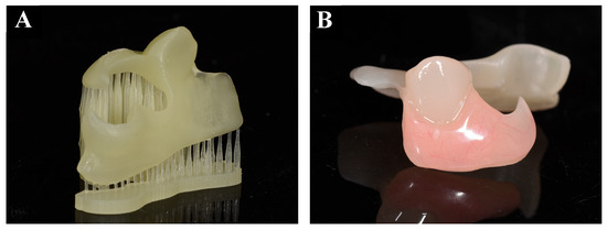 One-body printing and gingival layering method. (A) Monochromatic printed flipper. (B) Flipper after layering with the gingiva resin.