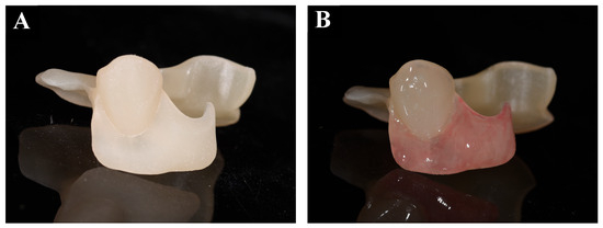 One-body printing and gingival coloring method. (A) Monochromatic printed flipper. (B) Flipper after gingiva characterization coloring.