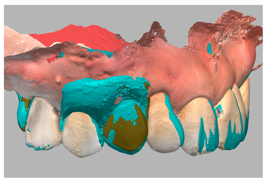 Each flipper was tried in the patient’s mouth (Figure 7), and adaptation was evaluated using the triple-scan technique [15,16] (Figure 8). For the triple-scan technique, three digital scans were taken using an intraoral optical scanner (i700). The first scan was an intraoral scan of the maxilla; the second, a fabricated flipper alone; and the third, the flipper seated in the defect area of the mouth. Data from these three scans were transferred to image inspection software (Geomagic DesignX, 3D Systems, Rock Hill, SC, USA). In the software, the first and second scans were aligned to the third scan using a point-cloud-based best-fit algorithm. After image matching, the third scan image was deleted. The results of the color-coded map on the fit accuracy of the flippers showed favorable adaptation of the flippers, and no significant difference was noted among the flippers fabricated using different methods (Figure 9). The buccolingual cross-sectional line images obtained at the position of the artificial tooth (#13) showed a discrepancy in tooth position within 0.5 mm.