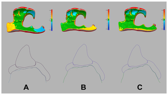 Color-coded map and cross-sectional images showing the adaptation of flippers. (A) Individual printing and combination method. (B) One-body printing and gingival layering method. (C) One-body printing and gingival coloring method.