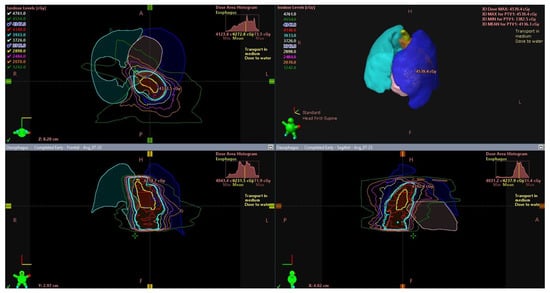 Five-year survival rates vary in different analyses and range from 31 to 66% [14,18,19,20,21,22,23] (Table 1). There are no studies directly comparing the effectiveness of combined EBRT and BT vs. surgical treatment, but the results seem to be slightly worse than those of surgical treatment (5-OS 77–85.5%) [24,25]. The diversity of results is influenced by the retrospective nature of the studies and the variety of treatment regimens. Teleradiotherapy doses range from 50 to even 70 Gy, conventionally fractionated in the dose range of 1.8–2 Gy [14,18,19,20,21,22,23]. The variety of brachytherapy regimens is even greater when low dose rate (LDR) and high dose rate (HDR) techniques are used. The number of fractions was from 1 to 4, and the fractional dose was from 3 to 7.5 Gy, which gave a different biologically effective dose (EQD2). EQD2 for the alpha/beta = 10 ratio ranged from nearly 10 to even 32 Gy, which gave a total biologically equivalent dose of over 70 Gy. Some studies also used concurrent chemotherapy, mainly based on cisplatin with 5FU. Current indications for radiochemotherapy alone recommend a dose of 50.4 Gy, conventionally fractionated without the use of brachytherapy, which is a much lower dose than in the above analyses. Late complications were related to BT dose and the number of fractions—17% for 12 Gy compared to 80% for 24 Gy [22]. Ulcers occurred in 3.5–20%, depending on the study. Less common complications included fistula, esophageal stricture, radiation pneumonia, and heart failure [10,12,14,15,16,17,18,19,20,21,22,23,26].