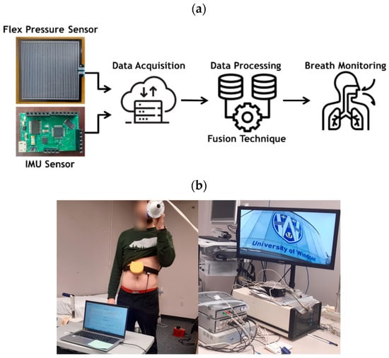 (a) Conceptual flow of our wearable multi-sensor system consisting of an inertial measurement unit (IMU) and a flexible resistive sensor connected to a data acquisition module, (b) picture showing our testing process and data collection and analysis experimental setup for breath monitoring.