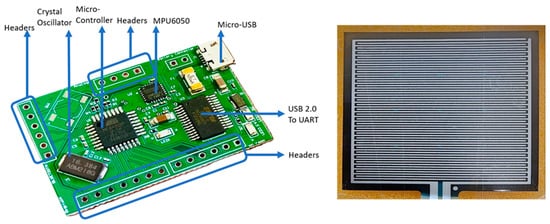 The basic hardware consists of an IMU and a flex resistive sensor. A data acquisition system and controller are needed to collect and process the sensor data; therefore, a data acquisition board was designed. Figure 2 shows the data acquisition hardware used for the wearable breathing sensor, which was designed and developed in-house. The board is developed using all commercially available electronic components and sensors. The breathing sensor hardware board shown in Figure 2 is made with a four-layer PCB (Printed Circuit Board) consisting of two main components, a microcontroller (Atmega328P, Microchip, Chandler, AZ, USA) and an IMU (MPU6050, TDK InvenSense, San Jose, CA, USA), which can measure 3-axis acceleration and 3-axis rotation motion. The board was synchronized with a 16.384 MHz oscillator. The Atmega328P consists of 2 KB SRAM, 32 KB Flash, and 1 KB EEPROM. The EEPROM is a nonvolatile memory, meaning that the data remains the same even if the power is off. Hence, once the board is programmed, it does not need to be programmed again. The MPU6050 communicates with the microcontroller via the I2C protocol. The MPU6050 detects inertial movement due to breathing- and non-breathing-related body movement. Flex pressure sensor data are collected via one of the analog pins on the board.