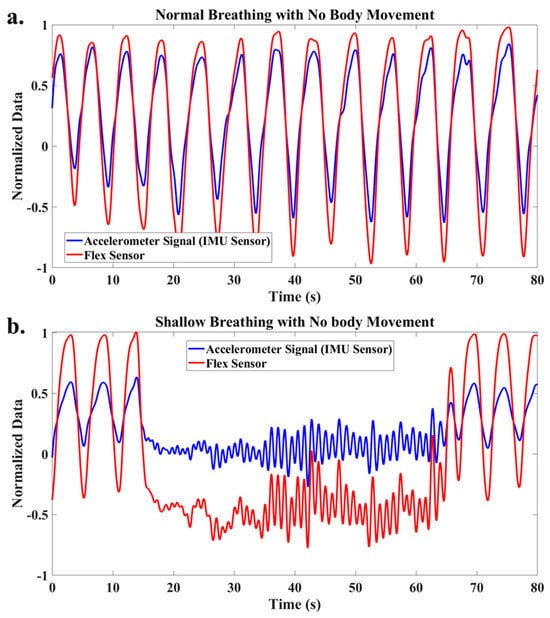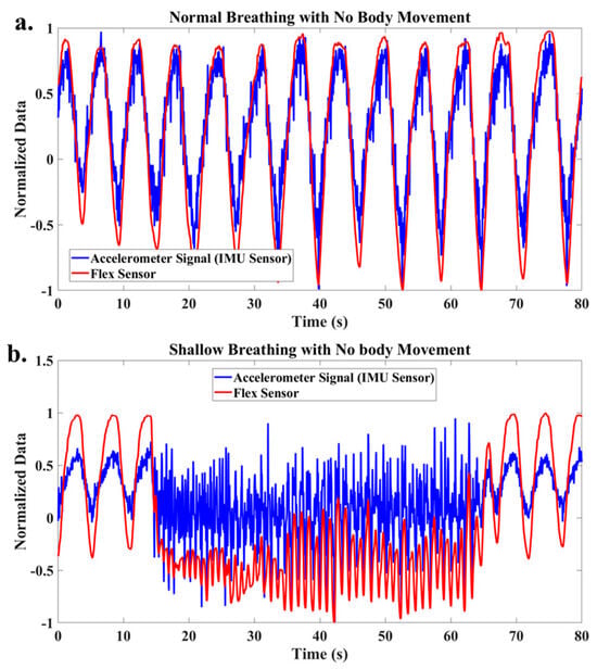 Figure 3 shows the accelerometer data in the normal direction and the flex sensor data during normal (Figure 3a) and shallow breathing (Figure 3b). Notably, there was no body movement during these breathing tests. This shows that without the body movement, both sensors can capture the breathing signal. Therefore, after data processing, it is possible to find the breathing rate and type from these data without sensor fusion when the participant is completely stationary and there is no body movement.