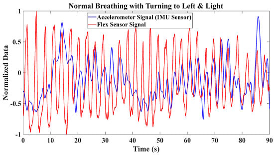 Accelerometer and flex sensor signals during normal breathing while body motion is present (turning left and right).