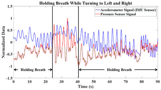 To address this issue, a test involving breath holding during body motion was conducted. Figure 6 shows a breathing test that includes two intervals of breath-holding while the participant turns to the left and right. During these intervals, it was anticipated that the flex sensor data would remain nearly constant. However, due to muscle motion during turns to the right and left, the flex sensor data exhibited cyclic behavior corresponding to the body’s motion. This cyclical pattern introduces the risk of false alarms when detecting breathing. Consequently, relying solely on a flex sensor is insufficient. Therefore, flex sensor data must be integrated with other sensory information.