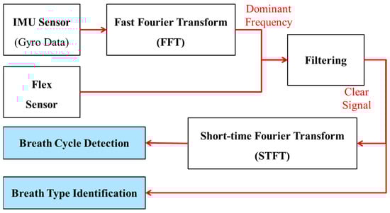 The fusion technique developed in this research is based on excluding information regarding body rotation from flex sensor data to achieve a signal that purely includes breath-related information. An overview of this proposed method is depicted in Figure 7. To capture information about the body’s rotational motion along three axes (x, y, z), the tri-axis gyro data from the IMU are utilized. To exclude the body movement data from the flex sensor data, a simple signal processing technique was used to identify the frequency contents. Fast Fourier Transformation (FFT) transforms the signal from the time domain to the frequency domain, providing a spectrum that illustrates the frequency components present in that signal. Employing FFT allows the identification of important frequencies associated with the body’s rotational motion. Once the dominant frequencies of body rotational motion are determined, they are removed from the flex sensor data through filtering. As a result, the filtered flex sensor data exclusively contain information related to breathing, making them suitable for breath monitoring.
