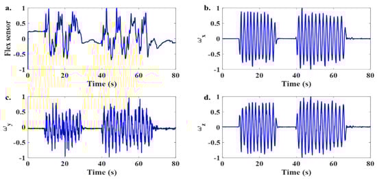 Time domain signal from the sensors during deep breathing with the presence of body movement. (a) Flex sensor data and (b–d) tri-axis gyro signals from the IMU sensor during a deep breathing test in the presence of body motion.