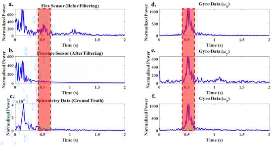 (a) FFT of the flex sensor signal before filtering, (b) FFT of the flex sensor signal after filtering, (c) FFT of the spirometer signal and (d–f) FFT of the tri-axis gyro signals of the IMU sensor. Red area showing dominant frequency in gyro data.