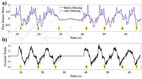 The flex sensor data before and after filtering are shown in Figure 10a, and the spirometer signal, serving as the ground truth, is illustrated in Figure 10b. Before applying the developed approach, the flex sensor data had 31 peaks, indicating 31 breath cycles. However, after applying the developed fusion technique, the number of breath cycles extracted from the filtered flex sensor data is seven, which is consistent with the count obtained using the ground truth. This demonstrates that, in this test, body motion leads to a false alarm rate of more than 300% in counting the breath cycles when the developed approach is not applied. The results highlight the effectiveness of the developed approach and its ability to avoid counting cycles corresponding to body motion as breath cycles.