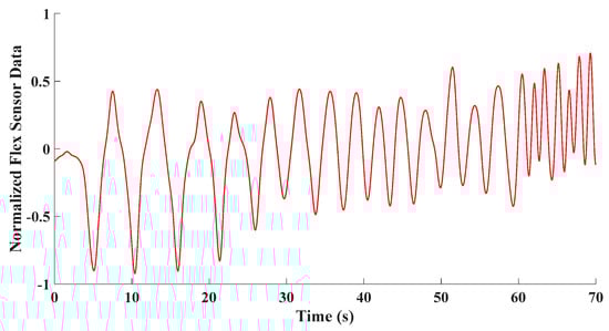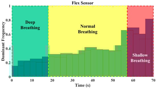 To assess how the developed approach can identify the type of breathing, a test involving deep, normal, and shallow breathing was considered. After the developed fusion technique is applied and nonrespiratory information is filtered from the flex sensor data depicted in Figure 11, the signal is segmented into 6 s time intervals with a 3 s overlap. Subsequently, the FFT is applied to each time interval to extract information concerning the frequencies present within that interval.