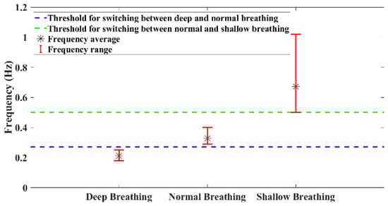 To determine distinct thresholds for breath type identification, experimental tests were conducted. Each participant was instructed to perform deep, normal, and shallow breathing. Figure 13 illustrates the ranges of dominant frequencies observed during these tests. Based on the results, the threshold between the two types of breathing was calculated by averaging the mean frequency of each breathing type. Based on Figure 12, the most dominant frequency of the experimental test within each time interval is shown in Figure 14. Using defined thresholds, it is possible to determine the types of breathing present in the test and determine the duration of each type of breathing. Based on the classification results, the number of breath cycles for each type can be determined.