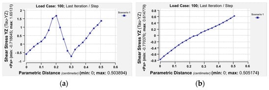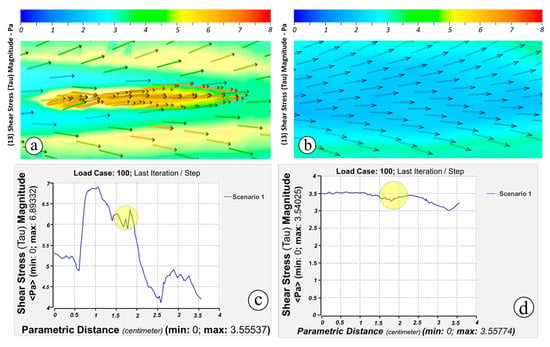 The results of this study indicate that there are quantitative changes in ESS when fatty streaks are present in the aortic wall. The ESS map in the presence of FS shows a distinctive corridor candidate highlighted in yellow with an oval shape. (Figure 2a) This region is not detected in the same geographical area without the presence of fatty streaks. (Figure 2b) The data for these changes are presented in Figure 2c,d, which depict the ESS values for 700 different longitudinal points of fatty streak position in both models. The graph of the aorta without fatty streaks (Figure 2d) is relatively linear in relation to the position and has an average ESS value of 3.5 Pa. However, when fatty streaks are added, there is a clear and significant change in ESS, as shown in the graph in Figure 2c, which has a double-peaked shape with the first peak at 6.8 Pa and the second peak at 6.3 Pa.