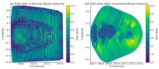 As depicted in Figure 3a, areas with an ESS greater than 5.5 Pa exhibit a distribution resembling a metaphorical dam on the surface of the FS. This occurs under conditions of a blood velocity of 120 cm/s and blood pressure ranging from 16,000 to 10,665 Pa. Upon increasing the blood velocity and pressure in the simulation by 40%, the areas with an ESS under 4.5 decreased in size by 80% (Figure 3b). Moreover, areas with an ESS exceeding 5.5 form a continuous shape, effectively eliminating spaces of low ESS that were previously trapped between the high ESS surface, thereby creating conditions suitable for a metaphorical dam reservoir.
