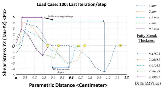 Assuming that lipids and other atherosclerotic plaque factors are influenced by the altered distribution of ESS, we can explore the progression of these forces and their potential implications as atherosclerosis advances. This study analyzed this in five different scenarios, as depicted in Figure 5. In each scenario, an influx of more lipids and cells into the LDL accumulation region (Figure 5) resulted in an increase in the thickness of the hypothetical dam structure.