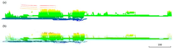 The MLS point cloud data used in this experiment were sourced from the research project “Intelligent Extraction of Structured Features of Highway Surfaces Based on Mobile Measurement Systems (2022KY09)” conducted by the Sixth Geological Brigade of the Jiangsu Geological and Mineral Bureau. The data pertain to the G25 expressway section from Lianyungang to Huai’an, with a mainline length of approximately 39.58 km. The data included information about roads, fences, trees, power lines, low vegetation, vehicles, and traffic signs, among other features. To validate the robustness and processing efficiency of the proposed method, we selected two typical scenarios from these data: a flat road section and a sloped road section, both of which were approximately 300 m (Figure 7). These datasets were used for the comparative analysis in this study.
