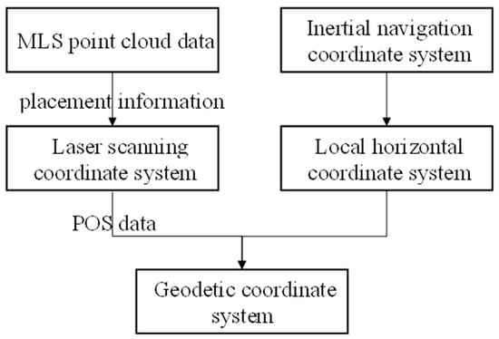 The point cloud data collected using the mobile laser scanning system, with coordinates in the laser scanner coordinate system, are referred to as the laser scanning data. The data obtained from the GNSS/IMU (Global Navigation Satellite System/Inertial Measurement Unit) integrated navigation system is referred to as POS (Position and Orientation System) data. This study aimed to fuse laser scanning and POS data through a data processing process to obtain coordinates in the Earth coordinate system. The specific process was as follows. First, the differential positioning GNSS data were processed using a Kalman filter to obtain the position and velocity information of the vehicle platform. Subsequently, by combining the pose information from the IMU data, the navigation positioning error was solved, and the error was input into the inertial navigation system to obtain the final position and attitude information. Finally, after completing the POS data computation, the obtained position and attitude information, along with the calibration information of the laser scanner placement, were used to transform the point cloud coordinates into the Earth coordinate system, and then the high-precision MLS trajectory data could be obtained. The specific process is illustrated in Figure 4.