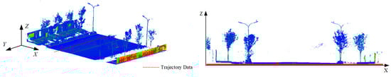 - The vehicle’s trajectory data and the 3D coordinates of the point cloud are projected onto a 2D plane (XOY) to determine the candidate seed supervoxel dataset {}, as shown in Figure 5.