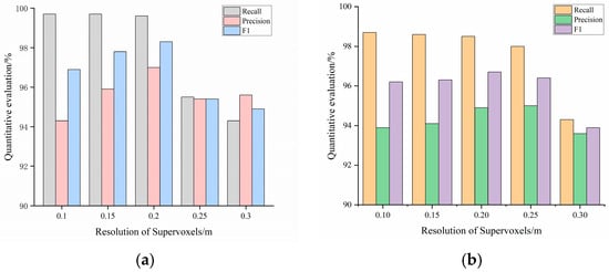 Based on the results shown in Figure 9, we observed that on flat roads, there was no significant difference in the segmentation accuracy when the supervoxel resolution size increased from 0.1 m to 0.2 m. However, when the supervoxel size exceeded 0.2 m, the segmentation accuracy significantly decreased. For instance, with a voxel size of 0.3 m, the recall rate and F1 score decreased significantly to 94.3% and 94.9%, respectively (as shown in Figure 9a). This decrease in accuracy was attributed to the inclusion of a large number of non-road point clouds because of the choice of a larger supervoxel resolution size. Additionally, for sloped road surfaces, a larger supervoxel resolution size resulted in lower accuracy.
