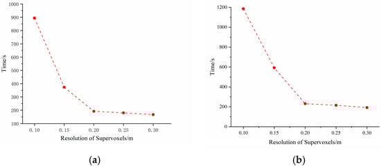 Furthermore, Figure 10 illustrates the computational time for different supervoxel resolution sizes in the two experimental scenarios. As shown in figure, compared to using a 0.1 m supervoxel resolution model, the processing time was significantly reduced when using a 0.2 m or 0.3 m supervoxel resolution model. For both scenes, the computational time with a 0.2 m supervoxel resolution was 3–4 times faster than that with a 0.1 m supervoxel resolution, while the accuracy did not significantly change.