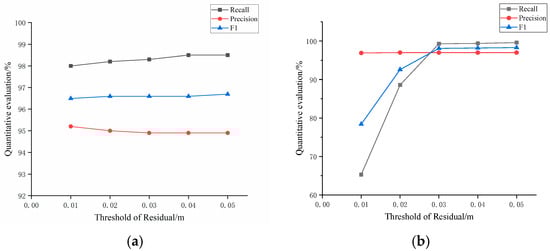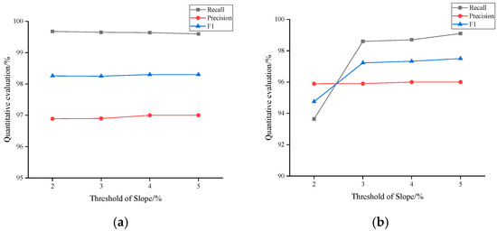 The slope threshold was determined based on the maximum values of the road’s cross and longitudinal slopes. Typically, highway cross slopes range from 2.5% to 4%; therefore, this study focused on four different slope threshold values. From Figure 11a, it can be observed that the slope threshold has a minimal impact on the accuracy of flat road surfaces. Similar results were obtained for sloped road surfaces when the slope threshold exceeded 2.5% (Figure 11b). However, the accuracy is poor when the slope threshold is 2% because of the excessively large longitudinal slopes, causing some road points to not be accurately identified. Therefore, to satisfy the threshold requirements for both experimental scenarios, in this study, 5% was chosen.
