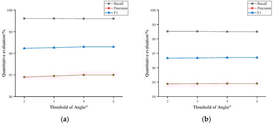 From Figure 12a, it can be observed that when the angle threshold varies from 2° to 5°, there is a slight variation in the accuracy for Site 1. This is because, with a smaller angle threshold, the segmentation precision improves in terms of details, but it may also lead to over-segmentation and noise generation. Similar results were obtained at Site 2 (Figure 12b).