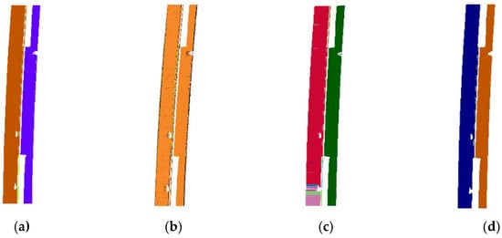 Extraction results of MLS point cloud surface for sloped road: (a) Euclidean clustering-based segmentation; (b) RANSAC-based segmentation; (c) traditional region growing-based segmentation; (d) improved region growing algorithm.