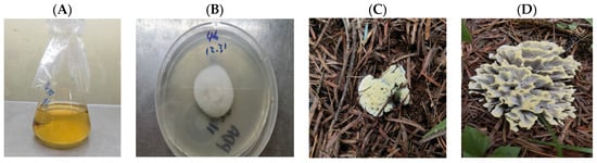 Figure 1. Thelephora ganbajun Zang: (A) liquid culture of the mycelium, (B) solid culture of the mycelium, (C) primordium, (D) fruiting body.