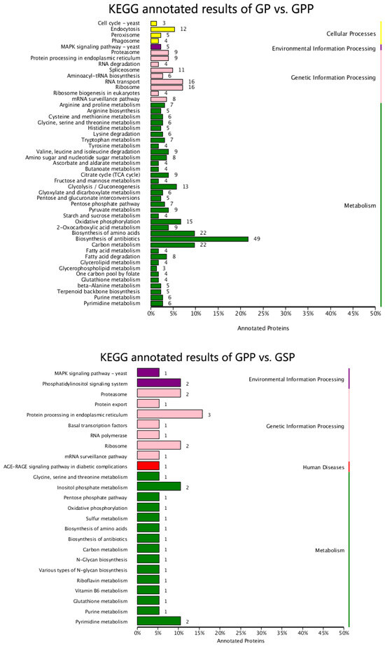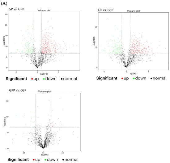 Protein expression exhibits spatio-temporal specificity, and proteins displaying noteworthy variations in expression levels under distinct conditions are referred to as differentially expressed proteins (DEPs). In this study, the collection of proteins derived from the analysis of differential expression was labeled as “A vs. B”. Specifically, T. ganbajun’s mycelium was designated as GP, its primordium as GPP, and its fruiting body as GSP. The DEPs were further categorized as up- or down-regulated proteins (Table 1) based on the relative expression levels observed between the two groups of samples.