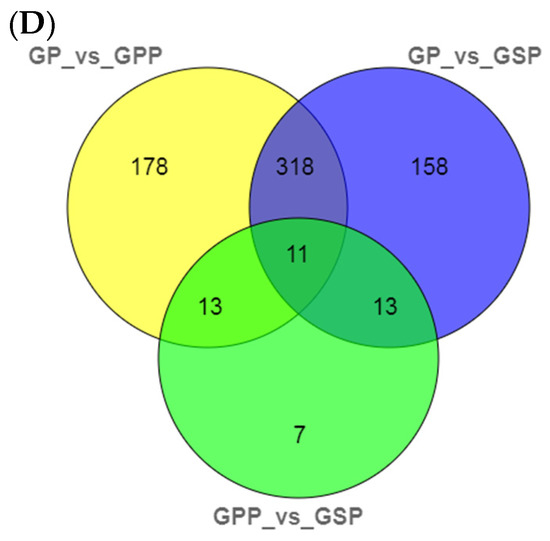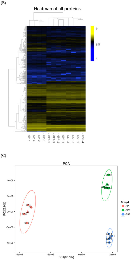 Significant distinctions between the two groups of DEPs are represented by volcano diagrams (Figure 2A) [30]. The volcano plot of differential protein expression across the three developmental phases revealed a pronounced difference in protein expression enrichment between the early mycelium stage and the mature primordium and fruiting body stages. Notably, the enrichment of DEPs between primordium and fruiting body was significantly diminished. To enhance the accuracy of evaluating DEPs, we repeated tests of the same samples and established correlation coefficients within the experimental design of differential expression [31]. Clustered heatmaps were used to represent the relationships of all sample proteins (Figure 2B). Principal component analysis (PCA) [32,33] was utilized to score each set group (Figure 2C). The resulting map illustrates that samples within each group were consistently categorized at the same level without aberrations. The observable compositional differences between distinct groups suggest that the principal component variances among biological replicates within the groups were minimal, indicating that the samples were in a normal condition. A Venn diagram was constructed to represent the sets of differentially expressed proteins for GP, GPP, and GSP (Figure 2D). Notably, 24 DEPs were common to both GP vs. GPP and GPP vs. GSP, while another 24 DEPs were shared between GPP vs. GSP and GP vs. GSP. Additionally, 329 DEPs were expressed in both GP vs. GPP and GP vs. GSP, and 11 DEPs were enriched in all three groups.