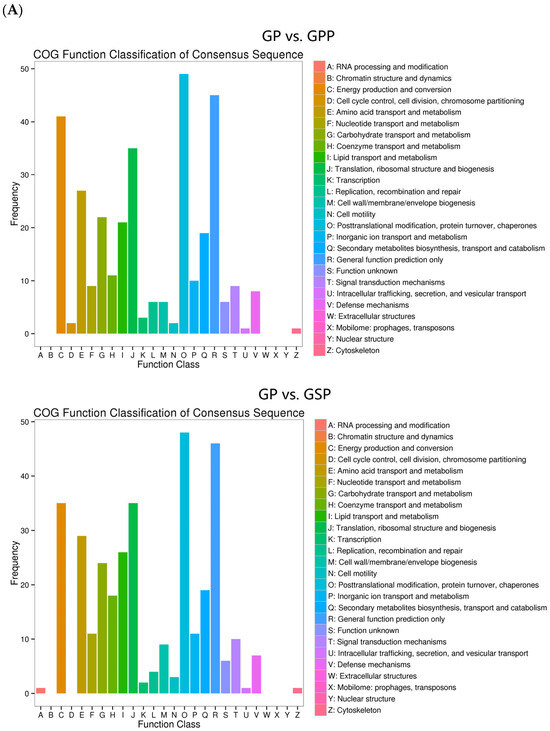 From the COG database annotation results (Figure 3A), we observed that during the developmental transition from GP to GPP, the highest number of differential proteins are enriched in post-translational modifications and protein translocation, followed by general functions and energy production transitions. Functions related to RNA processing modification, chromatin structure, prophage, transposons, and nuclear structure did not show significant enrichment. A similar trend is evident in the transition from GP to GSP, where we observed the highest number of differential proteins. It is hypothesized that this function plays a pivotal role in sclerotium formation through mycelium coalescence, nutrient accumulation, and functional proteins. The biosynthesis function was found to be weakened between the transition from the GPP to the GSP stage, indicating a cessation of biological processes related to fungal morphology construction and ectomycorrhizal formation. Instead, a considerable amount of nutrient conversion into energy was needed to support growth. Proteins involved in specific functions were not enriched during this stage. In addition to protein translocation, differentially expressed proteins increased in secondary metabolite biosynthesis, transport, and catabolism; energy production conversion; and amino acid and carbohydrate transport metabolism. During the reproductive growth of the fruiting body, intensified mitosis and a surge in expressed products were involved in cell division, promoting the construction of sporophores and further development.