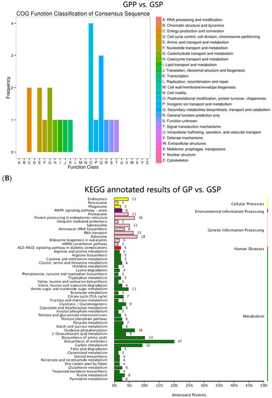 Figure 3. Enrichment analysis results of differentially expressed proteins: (A) COG, (B) KEGG.