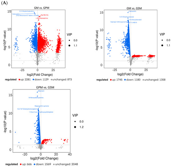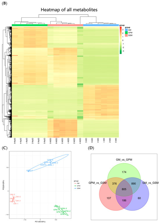 In the metabolomic analysis, we designated T. ganbajun’s mycelium as GM, its primordium as GPM, and its fruiting body as GSM. While differences within groups were not pronounced, they were evident. PCA scores (Figure 4C) were then determined for each group, revealing that samples in the GM group were more discrete. However, samples in the GPM and GSM groups shared similar principal components, with each group being consistently categorized at the same level and devoid of anomalies. The statistics of the number of differentially expressed metabolites (DEMs) in each group are presented in Table 2. Volcano plots were constructed to visually depict the differences in metabolite expression levels between two groups (Figure 4A), along with the statistical significance of these differences. Notably, significant differences in metabolite expression were observed in all three developmental stages. Comparative analyses, including mycelium vs. primordium and mycelium vs. fruiting body, revealed more DEMs, with the majority of metabolites being up-regulated and displaying a dispersed pattern, mirroring the findings in the proteomic enrichment. Conversely, the number of DEMs during the primordium and fruiting body stages was significantly lower, and they were more concentrated compared to the previous stage, suggesting a stabilization of metabolic levels. In the heatmap of all metabolites (Figure 4B), samples from the same group are clustered, and samples from different groups are significantly differentiated. The redder the color, the higher the metabolite expression, and the greener the color, the lower the metabolites expression. GM during the nutrient growth period and GPM and GSM during the reproductive growth stage were highly differentiated, with correlation coefficients for the biological replicates in the same stage of 0.9, meaning the different stages were clearly separated. According to the Venn diagram of the enrichment results (Figure 4D), 1695 DEMs were common to GM vs. GPM and GM vs. GSM, 1181 DEMs were common to GM vs. GPM and GPM vs. GSM, 991 DEMs were common to GM vs. GSM and GPM vs. GSM, and 805 DEMs were enriched in all three groups.