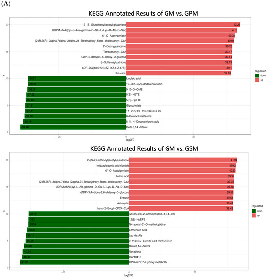When conducting KEGG annotation (Figure 8A), multiple pathways are often annotated for both differential metabolites and differential genes. In such instances, prioritizing genes and metabolic pathways with a p-value < 0.05 for analysis can allow for the swift identification of pathways related to the study’s objectives. In the two-layer omics clustering, the common pathway with a p-value < 0.05 in the GM vs. GPM stage for both transcriptome and metabolome was found for the biosynthesis of amino acids. In the GPM vs. GSM stage, transcriptome pathways with a p-value < 0.05 included arginine and proline, ascorbate and aldarate, β-alanine, and biotin metabolism. Metabolomic pathways with a p-value < 0.05 included arginine and amino acids biosynthesis. Although no significant common metabolic pathways were enriched at this stage, folate biosynthesis and histidine metabolism showed high correlation with the transcriptome. KEGG co-enrichment results revealed common pathways in the transcriptome and metabolome at different stages of T. ganbajun development. This may offer insights into the positive/negative regulation of metabolites by genes, emphasizing that metabolites are not necessarily directly correlated with the gene expression profile.