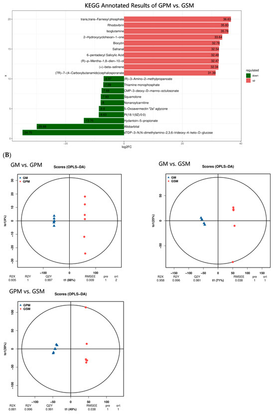 Following qualitative and quantitative analyses of the detected metabolites, the quantitative information on metabolite changes within each subgroup could be effectively reflected through the log2-processed multiplicity of differences. This highlights the variability in metabolite quantities across sample stages (Figure 5A). Metabolomics data are characterized by high dimensionality (numerous types of metabolites) and small samples (limited scale). They encompass both differential variables related to categorical variables and a multitude of undifferentiated variables that may have correlations. Analyzing these high-dimensional variables with the PCA model often poses challenges. Inter-sample variance can be reflected in the principal components, which can fail to accurately reflect the specific numerical differences between samples. To address this, we employed the OPLS-DA statistical method to further process the PCA results.