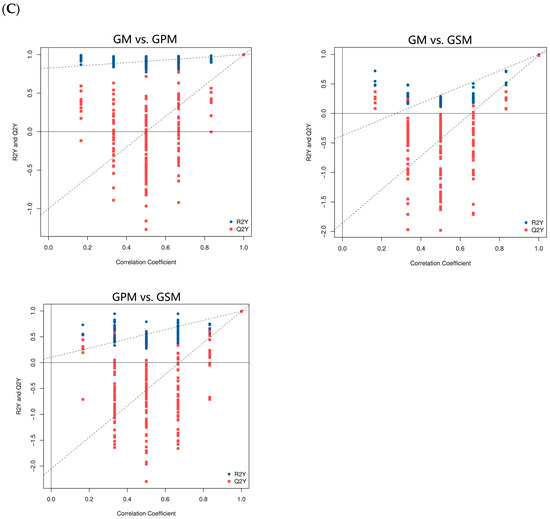 OPLS-DA filters out orthogonal variables in metabolites not related to actual variables. It then cross-analyzes non-orthogonal variables and the remaining irrelevant variables that align with the expected results. This process omits low-scoring samples, enhancing the data prediction reliability. The evaluation model’s predictive parameters, R2X, R2Y, and Q2, play pivotal roles (Figure 5B). R2X and R2Y represent the explanation rate of the constructed model for the X and Y matrices, respectively. Here, the X matrix denotes the model input, representing the metabolite quantification matrix, while the Y matrix signifies the model output, representing the sample grouping matrix. Q2 represents the predictive ability of the model (Figure 5C). The closer R2Y and Q2 are to 1, the more stable and reliable the model is. Hence, the test model successfully distinguished between different sample subgroups based on differential metabolite expression. This model proved useful for screening effective models (Q2 > 0.5) and excellent models (Q2 > 0.9) across all sample groups.