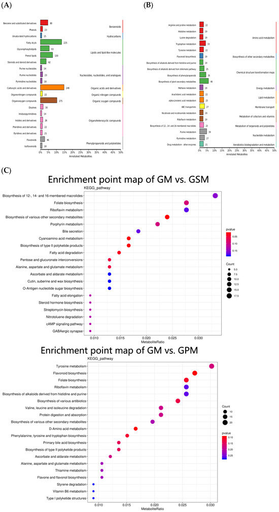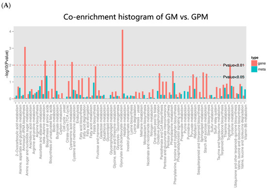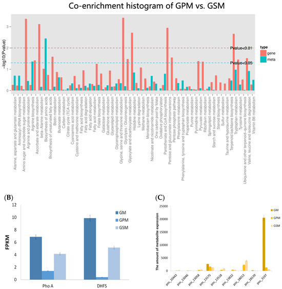 Figure 8. Co-analysis results of transcriptome and metabolome: (A) Co-enrichment histogram of differential metabolites and genes for GM vs. GPM and GPM vs. GSM; (B) trend map of differential gene expression in folic biosynthesis; (C) metabolite expression quantity in folic biosynthesis.