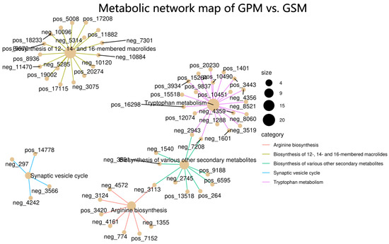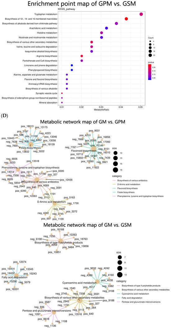KEGG annotation (Figure 6B) revealed metabolites exhibiting significant quantitative differences. Notably, there was a substantial enrichment in the biosynthesis of plant secondary metabolites (9.96%), followed closely by the purine metabolism and pyrimidine metabolism, accounting for 7.93% and 5.49%, respectively. Additionally, there were high percentages of certain amino acids and biosynthesized compounds among all differentially expressed metabolites (DEMs). Beyond those merely supporting growth, complex compounds were formed that are intricately involved in the biological processes of cell differentiation and reproductive development. By leveraging ClusterProfiler (https://bioconductor.org/packages/release/bioc/html/clusterProfiler.html) for the KEGG annotation of differential metabolites (Figure 6C) and generating a network diagram (Figure 6D), it was found that the differential metabolic pathways were notably enriched in the GM vs. GPM phase, which included flavonoid and folate biosynthesis. This indicates a resemblance to the early development of this species. Flavonoids, which are mostly found in plants and are mostly bound to sugars in the form of glycosides or carbon sugar groups, synthesize phytochrome [34]. Folate is involved in vitamin synthesis, providing the necessary substances for producing enzymes and immune-enhancing effects, and offering sufficient trace elements for cells to fulfill all basic life activities.