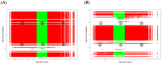 We opted for two models that satisfied the criteria of intergroup association analysis, i.e., maximizing differences in components: the mycelium vs. primordium (GM vs. GPM) and primordium vs. fruiting body (GPM vs. GSM) phases. Our analysis delved into the correlation and expression trend of each component. The outcomes of this screening, coupled with the differential folds, were visually represented in a nine-quadrant plot (note: the plot could not be generated when the metabolite differential folds threshold was 1) (Figure 7A,B) [40,41]. Given that the up- and down-regulated expressions of genes and metabolites did not meet the FC screening conditions individually, we focused on six quadrants to depict the fundamental expression trends of genes and metabolites. Quadrants 3 and 4 indicated that gene and metabolite expression trends were consistent, implying potentially positive regulation of the metabolite by the gene. Conversely, quadrants 1 and 6 indicated opposite expression trends, signifying a negative correlation between gene and metabolite. Quadrants 2 and 5 suggested that the gene remained unchanged while the metabolite underwent up- or down-regulation.