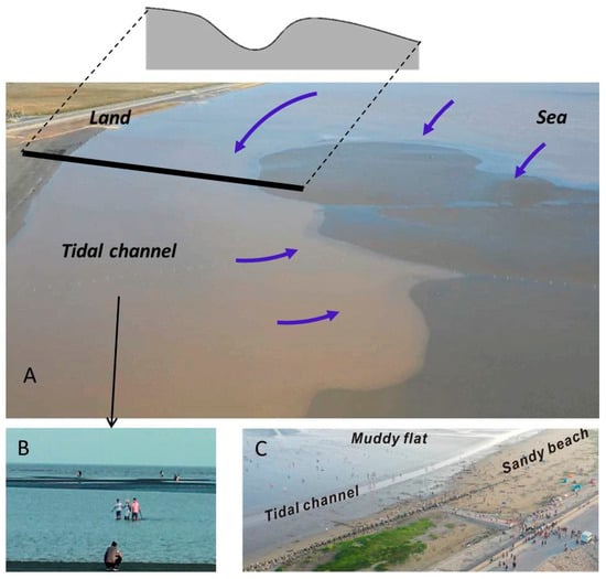 (A) Aerial photograph captured during the rising tidal level, with the black solid line indicating the section position and the blue arrows illustrating seawater submerging the tidal channel initially and subsequently surrounding the lower tidal flat; (B) the scenario where individuals recognize the need to return to land, but the seawater has already reached a considerable depth in the tidal channel; and (C) aerial photograph taken during the low tidal level, depicting numerous tourists on the lower tidal flat.