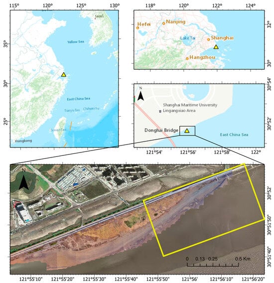 The study area, Lingang tidal flat (LGTF), is located on the south coast of the Shanghai Lingang New Area, which is situated at the intersection of the Changjiang River Estuary and Hangzhou Bay. Its exact location is shown in Figure 3. As of 21 November 2023, the tidal flat area measures approximately 2.54 km2, with an alongshore extent of around 4 km and a maximum offshore extent of approximately 1 km. The maximum extent of the tidal flat area was ~4 km2 based on the satellite image from 2018 [13]. The tide pattern follows a regular semi-diurnal cycle, featuring a tidal range of ~4.5 m during spring tide and ~2.8 m during neap tide. The Changjiang River’s maximum flood discharge is 92,600 m3/s, and the minimum low-flow discharge is 4620 m3/s. The multi-year average discharge is approximately 29,000 m3/s, with an annual runoff volume of 9 × 1011 m3 [39]. The river runoff exhibits significant seasonal variations, with May to October considered the flood season, accounting for 71.7% of the annual runoff, and November to April of the following year being the dry season, contributing 28.3% of the annual runoff. The annual suspended sediment concentration averages 0.468 kg/m3, with a maximum sediment transport of 678 million tons (in 1964) and a minimum of 239 million tons (in 1994), averaging 433 million tons annually. Due to the large amount of suspended sediment from the Yangtze River and strong variable hydrodynamic conditions, a dynamic tidal flat and a supratidal zone with dense vegetation have been formed. The LGTF consists of a small portion of sandy beach (which might be submerged under extremely high tidal levels) and a large area of mudflats, with noticeable tidal channels between them. Both the intertidal topography and the positions of the tidal channel have been dynamically changing in recent years [13]. The existence and depth of tidal channels, along with the topographical distribution of the LGTF, have a substantial impact on the risk assessment.