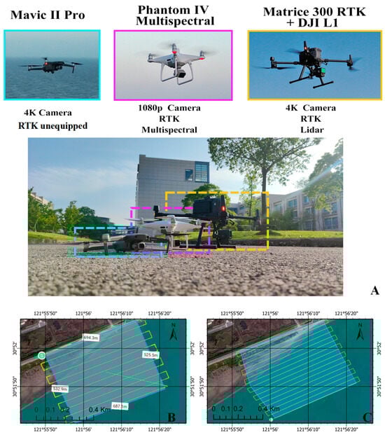 (A) UAVs employed in this study; (B) the planned route of Matrice 300; (C) the planned routes of Phantom IV and Mavic II.
